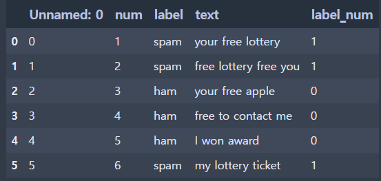 - 메일본문(입력 테스트)을 이용하여 메일이 스팸인지 구분하는 예시를 살펴보자