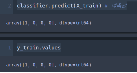 y_train(실제값)과 classifier.predict(X_train) (예측값)을 비교했을 때 정밀도, 재현율, f1 스코어 모두 1로 높은 값으로 나왔다.
