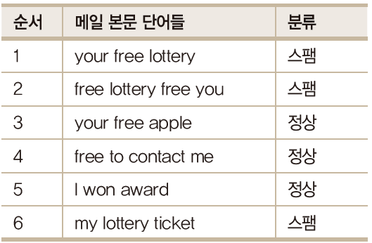 $$P(정상메일 | 메일본문) = P(my | 정상메일) X P(free | 정상메일) X P(lottery | 정상메일) X P(정상메일)$$