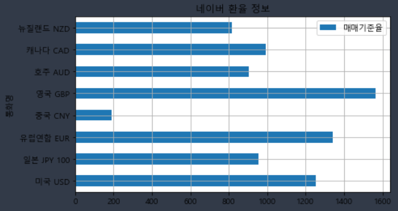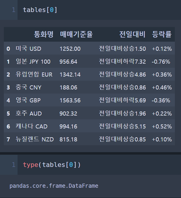 >> url을 판다스로 불러들어 index를 '통화명', column에 있던 '통화명'을 '외환'으로 바꿔줌