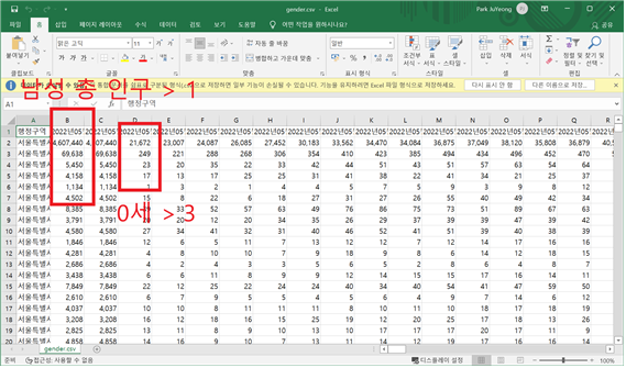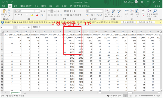 여 인구수 > row[-103] / 연령구간인구수 > row[-102] / 0세 > row[-101] / 100세 > row[-1]
