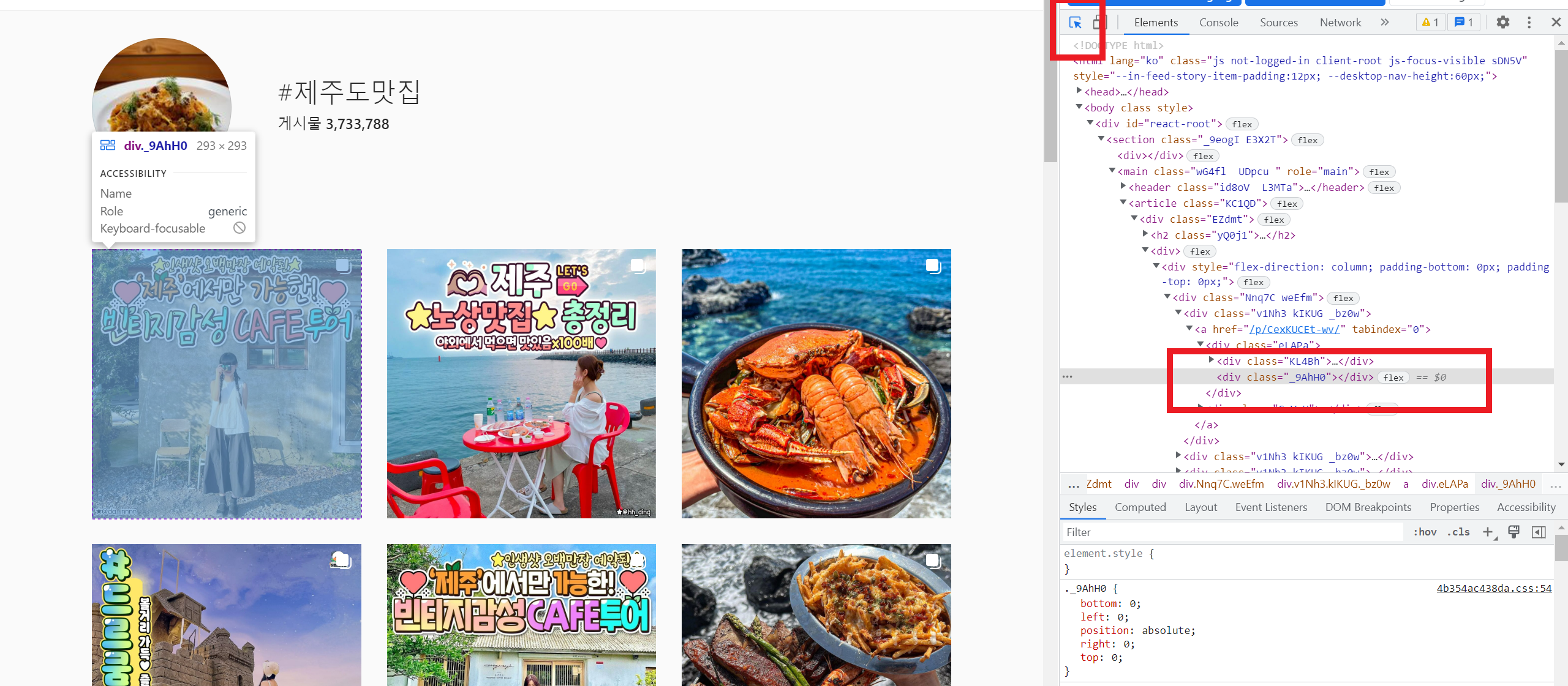 insta_searching() 함수를 이용해 '제주도맛집'에 대한 인스타그램 검색 결과 확인하는 URL 생성