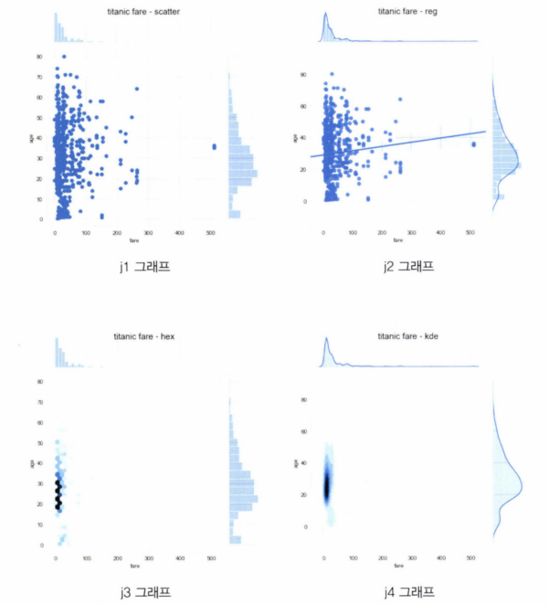sns.jointplot(): 조인트 그래프- 산점도를 기본으로 표시하고, x-y축에 각 변수에 대한 히스토그램 동시에 보여줌