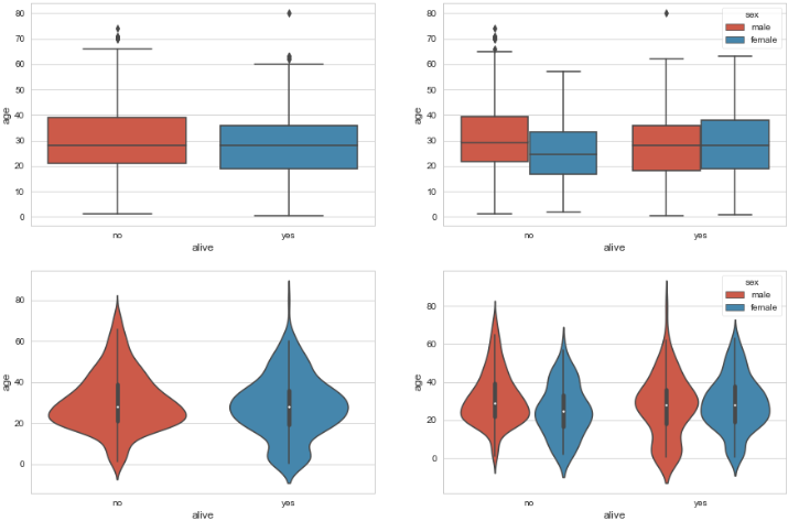 sns.violinplot(x='alive', y='age', hue='sex', data=titanic, ax=ax4)