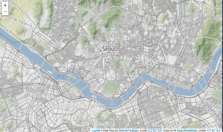 Map(tiles=''): 지도에 적용하는 스타일 변경하여 지정 가능folium.Map(tiles='Stamen Terrain')- 산악 지형 등의 지형이 선명하게 드러남