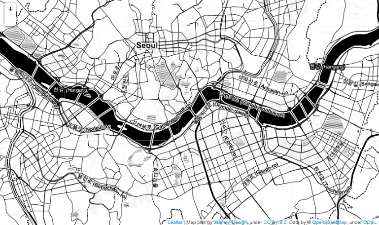 folium.Map(tiles='Stamen Toner')- 흑백 스타일로 도로망을 강조해서 보여줌