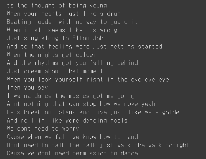 한글 가사보다 영어로 된 가사가 전처리하기 쉬울 것 같아 Permission to dance로 하기로 했다.
