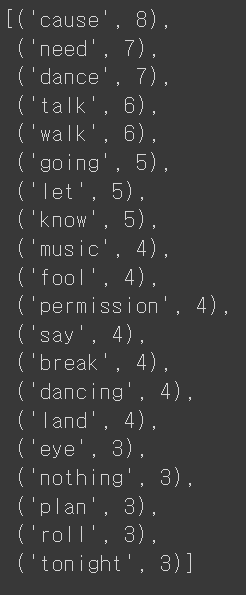 print(counter.most_common(k)) # 빈도 수 기준 상위 k개 단어 출력