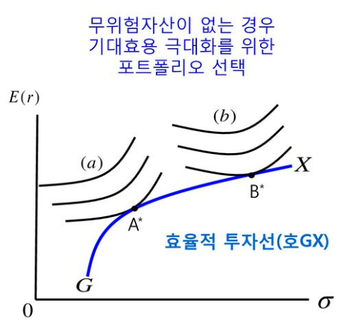 - 위험회피성향이 약한 투자자 b는 포트포리오 B를 선택함으로써 기대효용 극대화