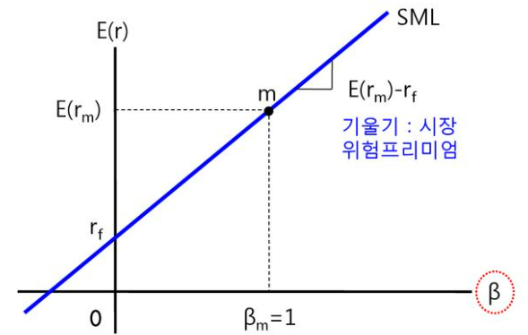 - 증권시장선(SML) : 시장에서 거래되는 모든 자산에 대해 균형 상태에서 위험과 수익률 간 관계 설명
